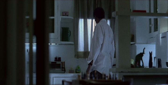 在影片的一开场,当雇佣杀手来到洛山矶机场时,观众就可以感受到在主要人物后面的背景中所出现的高强度的冷暖颜色(图7a,图7b),同时由于景深较小,背景中的色彩是以比较“虚”的一种状态相互“粘合”在一起。这样既不干扰对主要人物的表现,又为整部影片的色彩结构奠定了基调。